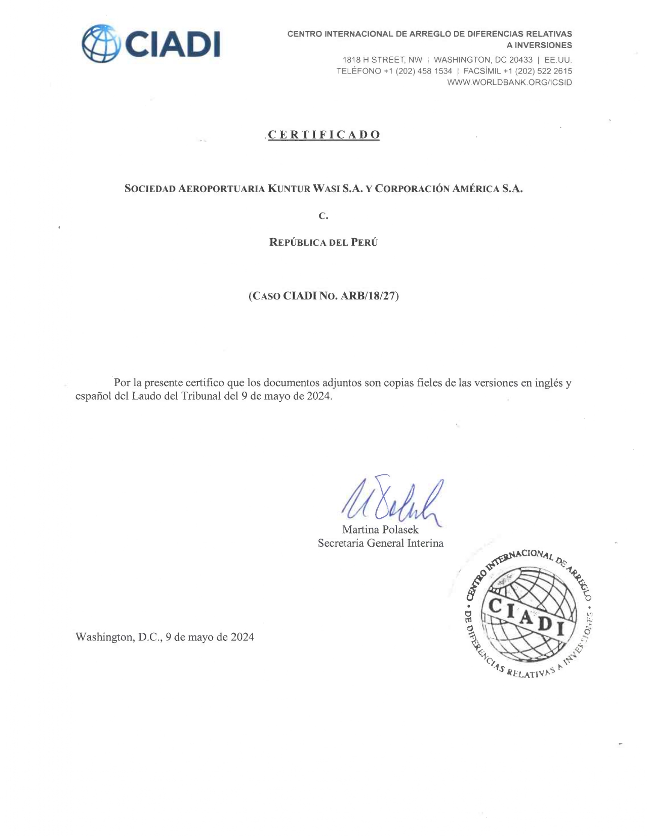 El Tribunal Arbitral del CIADI determinó expresamente que no existían razones suficientes para sostener la ilegalidad de la Adenda N.° 1, descartando que su suscripción hubiera vulnerado el marco normativo aplicable. Asimismo, precisó que las observaciones y recomendaciones de la Contraloría no tenían carácter vinculante, por lo que no obligaban al MTC ni podían invalidar sus decisiones contractuales. El laudo reconoce que el Ministerio actuó dentro de sus facultades discrecionales legalmente otorgadas para modificar el contrato de concesión, y que impedir la adenda por interpretaciones formalistas habría hecho inviable el cierre financiero del proyecto, frustrando la finalidad práctica del contrato.