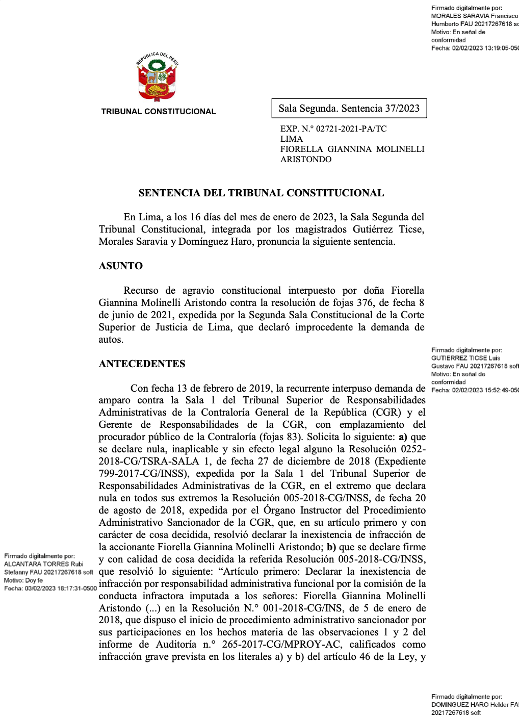El máximo intérprete de nuestra Constitución también se pronunció. En la Sentencia 37/2023, el Tribunal Constitucional (TC) declaró fundado mi proceso de amparo y ordenó el archivo definitivo de cualquier procedimiento administrativo sancionador iniciado por la Contraloría en mi contra por este caso.