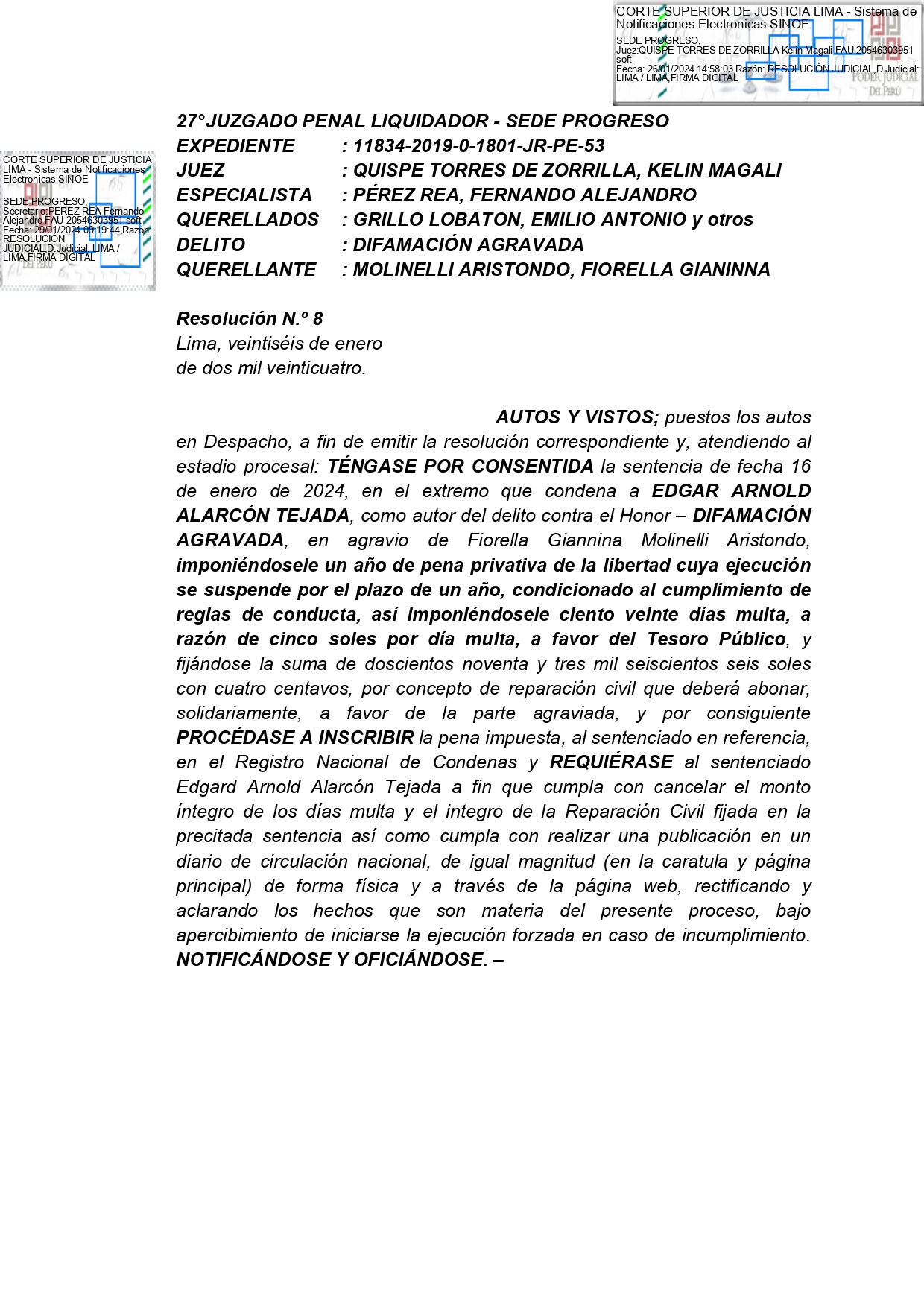 Durante mucho tiempo, el excontralor Edgar Alarcón fue el principal promotor de las mentiras en mi contra. Hoy puedo decirles que la justicia también actuó en este frente. El 27° Juzgado Penal Liquidador de Lima lo condenó por el delito de DIFAMACIÓN AGRAVADA en mi agravio.
