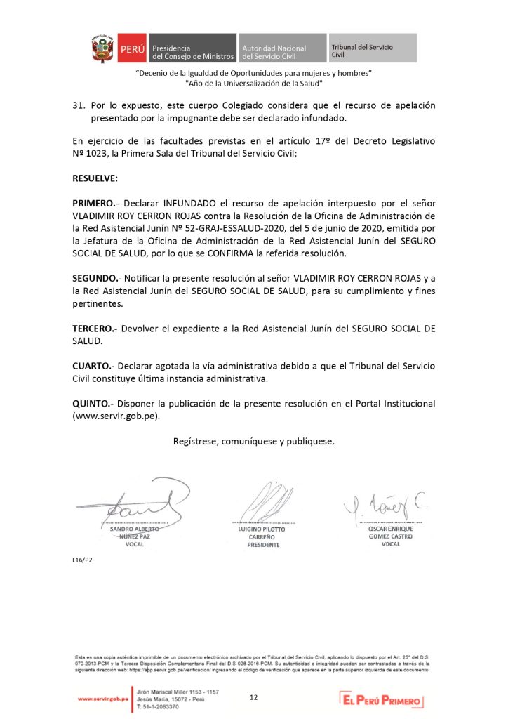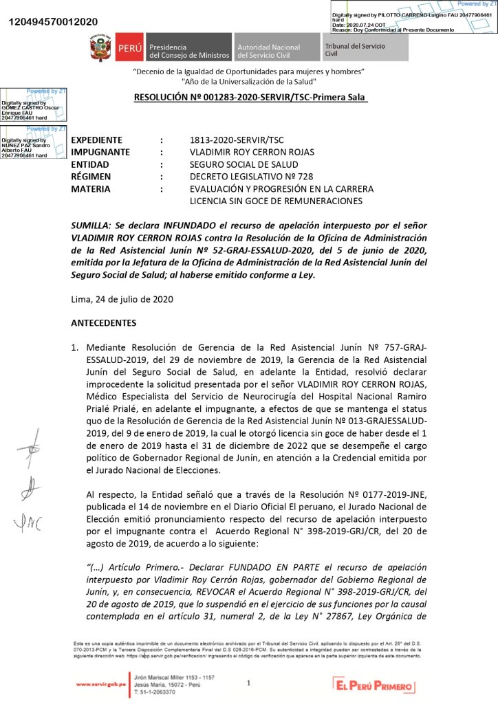 Cerrón pretendía mantener una licencia sin goce de haber de manera indefinida, alegando su cargo político, pero llevamos el caso hasta la última instancia administrativa. El Tribunal del Servicio Civil (SERVIR), mediante la Resolución Nº 001283-2020-SERVIR/TSC-Primera Sala, nos dio la razón de manera definitiva al declarar infundado su recurso de apelación, confirmando que su salida fue conforme a ley.